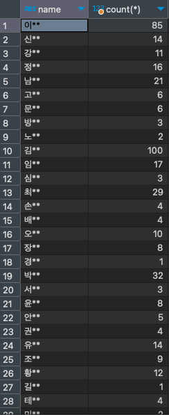 사실 이** 씨에 해당하는 row의 개수는 85개인데, 이를 축약해서 결과값으로 보여주고 있다.