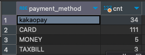 [ 웹개발 종합반의 결제수단별 주문건수 세어보는 쿼리 + 카운트 별 오름차순으로. ]