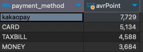 -- 결제수단별 유저 포인트의 평균값 구해보기.