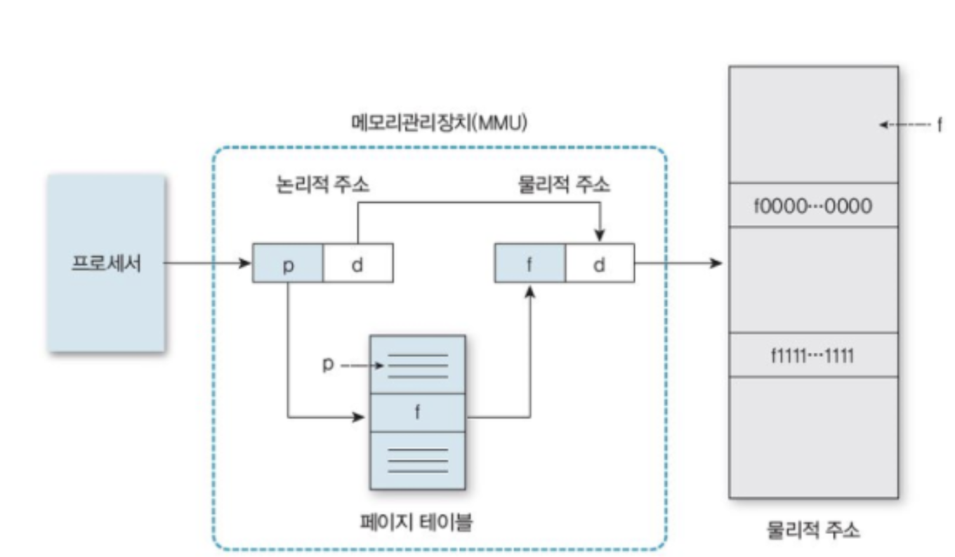 : 가상 주소 공간은 메모리 관리 장치(MMU)에 의해 물리 주소로 변환된다.